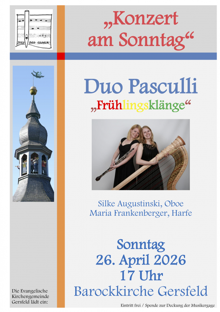 Zu „Frühlingsklängen“ in der Barockkirche laden Silke Augustinski (Oboe) und Anna-Maria Frankenberger (Harfe) ein. Es erklingen Werke vertrauter, aber auch wenig bekannter Komponisten und Komponistinnen [...]